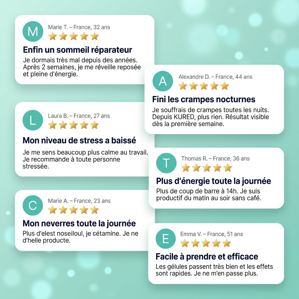Données collectées auprès de 1 247 clients vérifiés ayant utilisé KURED Complexe Magnésium pendant au moins 30 jours. Adultes âgés de 35 à 65 ans. Collecte 2024. Les résultats individuels peuvent varier.